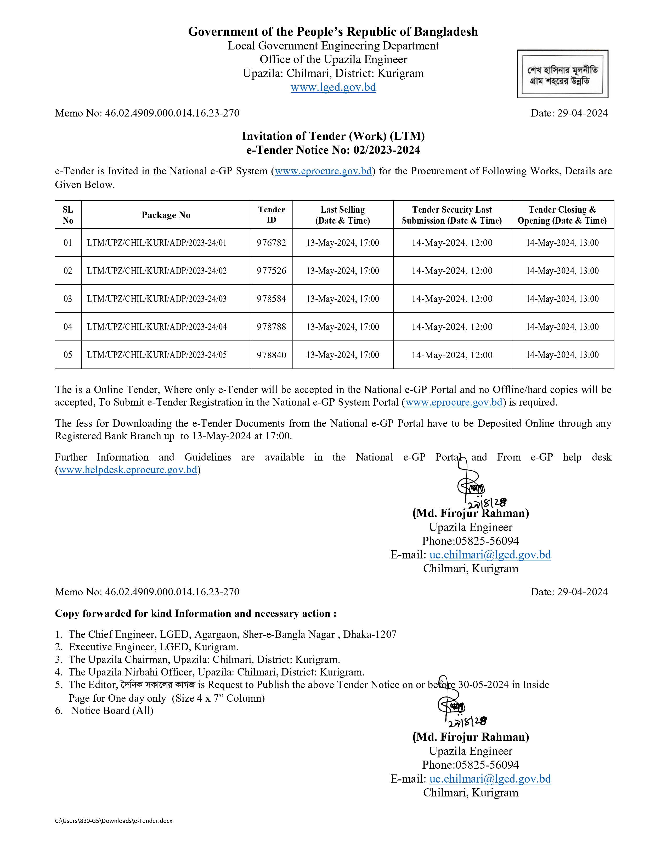 | শিরোনাম | বার্ষিক উন্নয়ন কর্মসূচি (ADP) উন্নয়ন প্রকল্পের আওতায় ২০২৩-২৪ অর্থ বৎসরের দরপত্র বিজ্ঞপ্তি। |